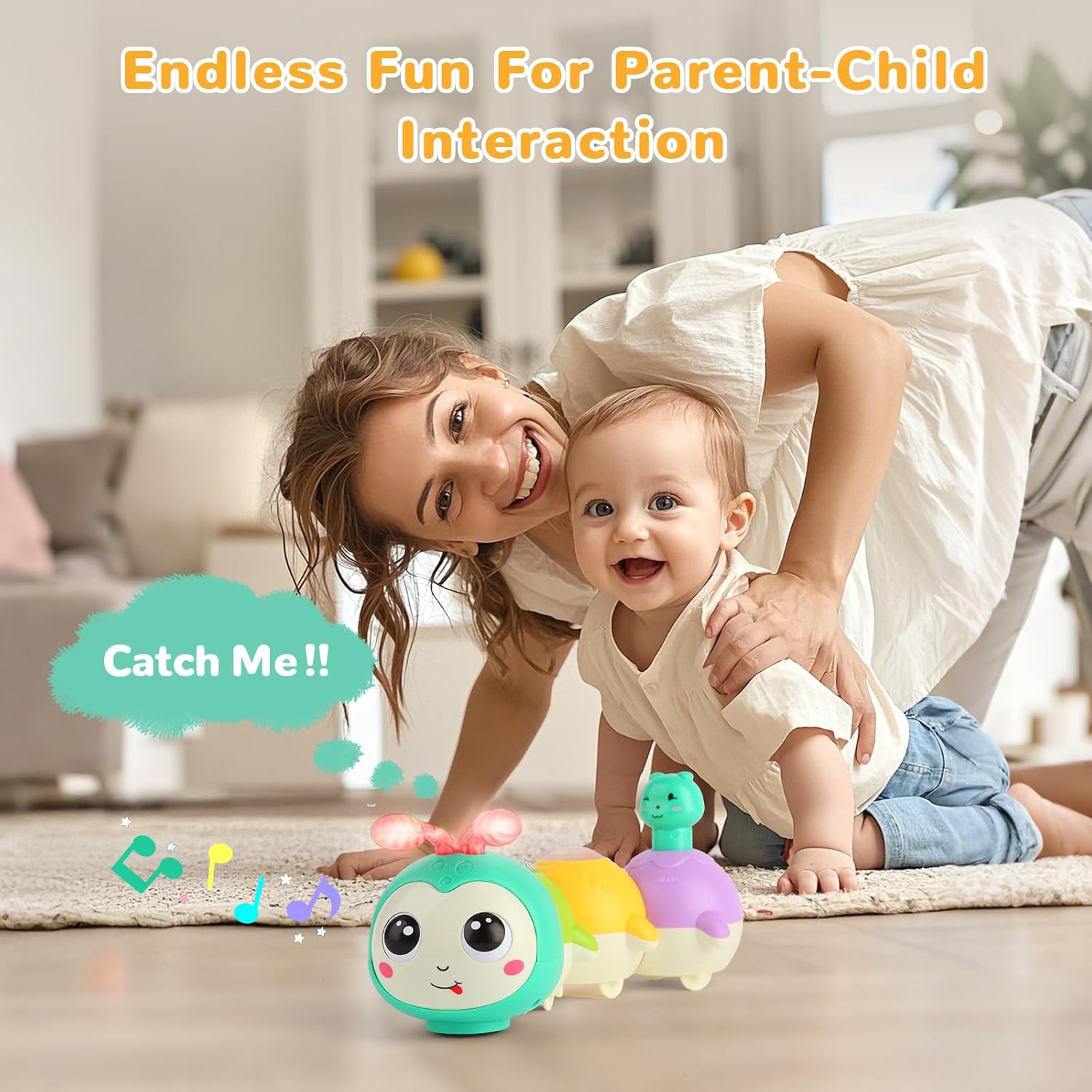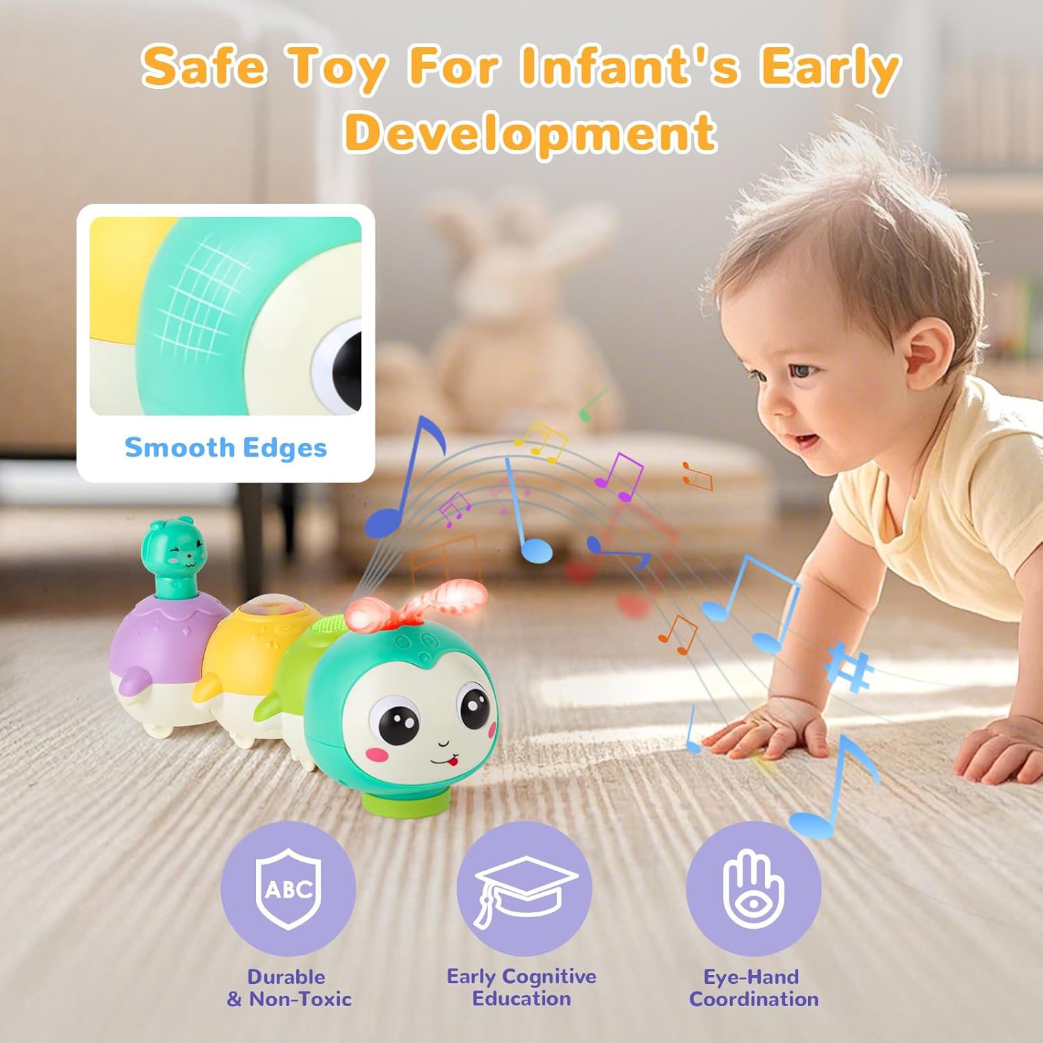 • Crawls forward with side-to-side movement, music 🎶 & lights ✨ to grab baby’s attention