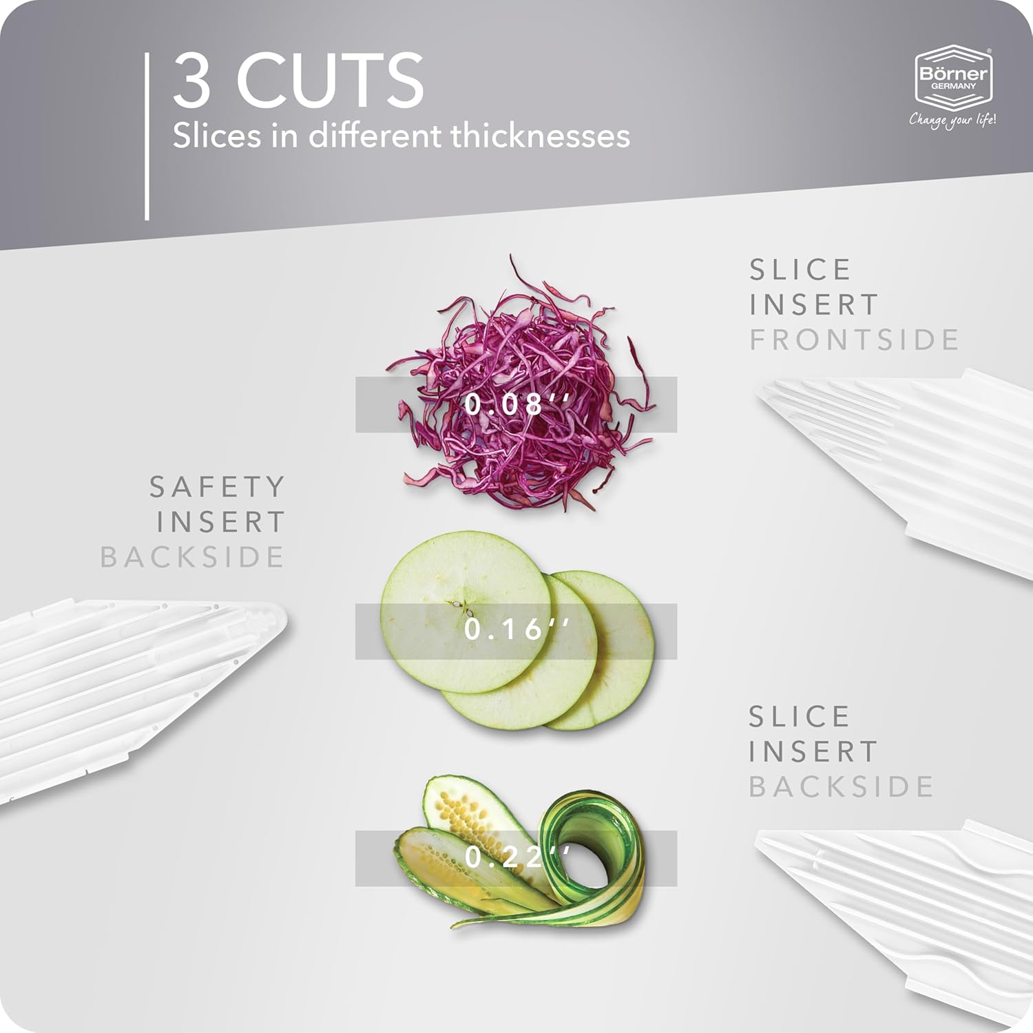 - Quickly slice, dice, and prep fruits and vegetables with two thickness options (3.5mm and 7mm).