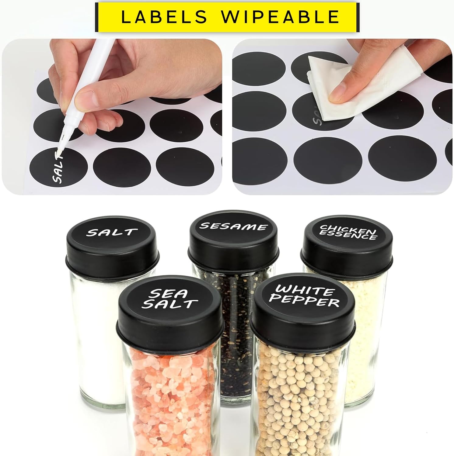 Write-and-wipe labels + funnel – mess-free refills, instant organization.
