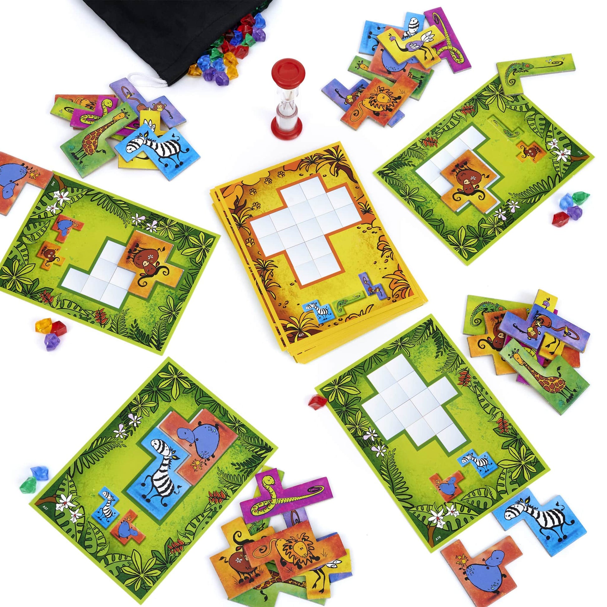 Ubongo! Junior brings the fun and exciting tile-placing challenges of the original Ubongo! puzzle game to younger players aged 5 and up. Designed to be both fun and educational, players must race to match their colorful animal tiles to fit a specific area on their puzzle boards.