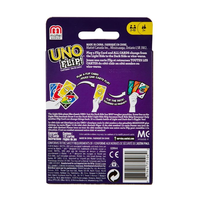 UNO FLIP! takes the beloved card game and doubles the fun with its unique double-sided deck. Add a new layer of strategy and excitement to every game night with the FLIP card that turns the deck upside down, revealing a darker, more competitive set of cards!