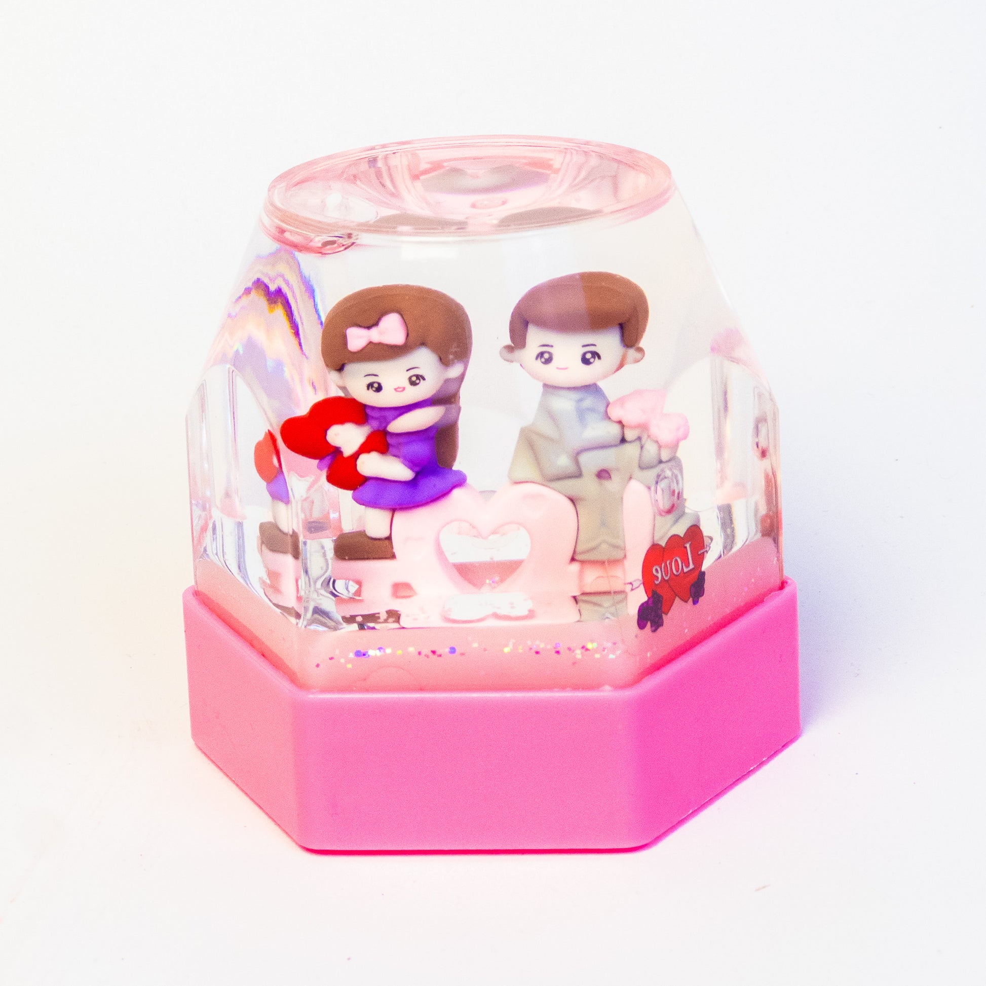 A charming little love scene captured inside a glowing crystal dome—cute, romantic, and impossible to ignore.